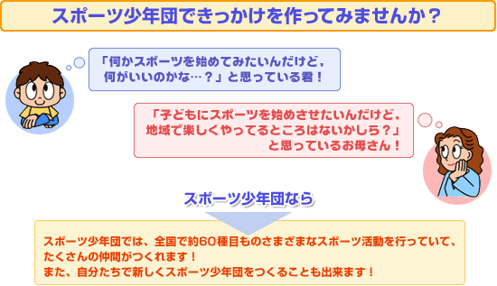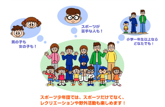 スポーツ少年団は、「1人でも多くの青少年にスポーツの歓びを!」「スポーツを通じて青少年の体と心を育てる組織を地域社会の中に!」と願い、財団法人日本体育協会が昭和37年に創設したものです。
